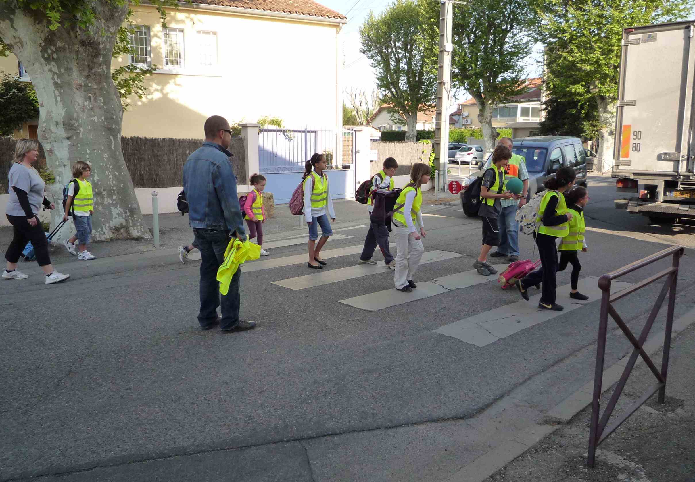 Elèves participant au pédibus et traversant la chaussée à Cavaillon (PNRL Sophie Billaud)
